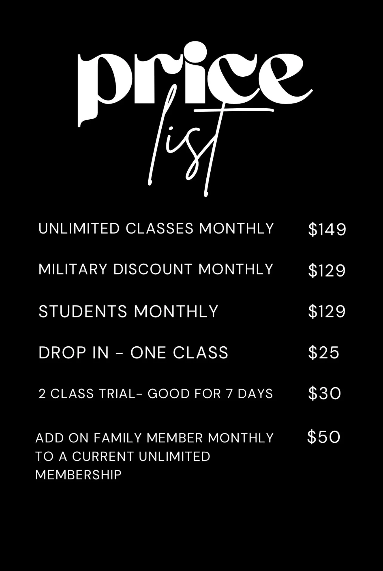 Please Cancel Weekday Classes with 6 hour notice to avoid a late cancel fee of $20